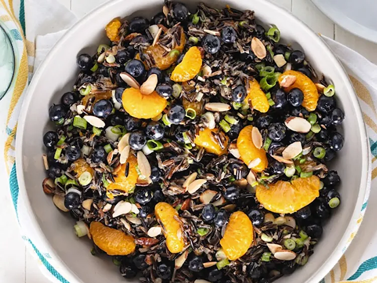 Allrecipes features several similar recipes: one blends turkey, grapes, almonds, and mayo into a creamy salad ; another vegetarian version includes artichokes, olives, peas, and herbs tossed in balsamic vinaigrette; and yet another mixes wild rice with bell peppers, nuts, cranberries, and a rice vinegar–basil dressing .